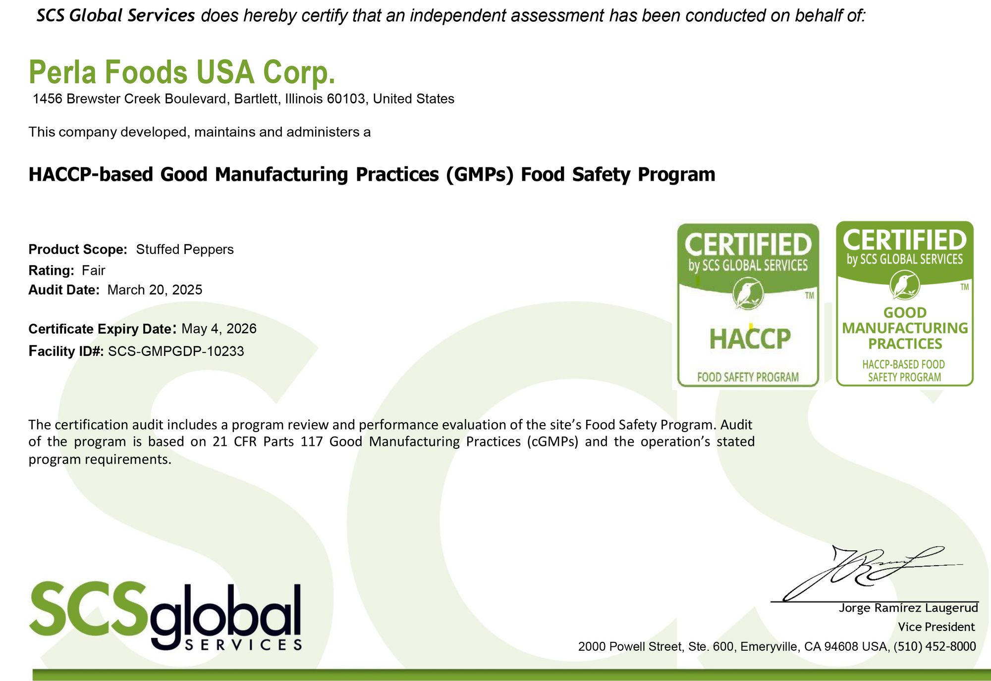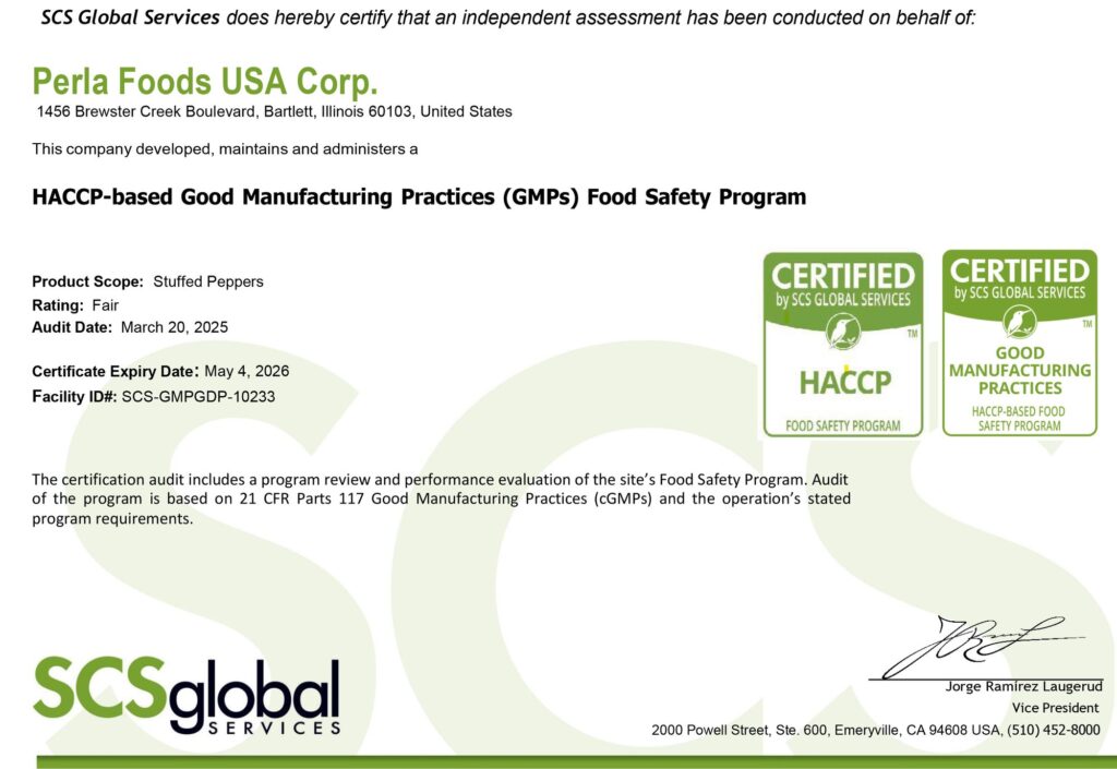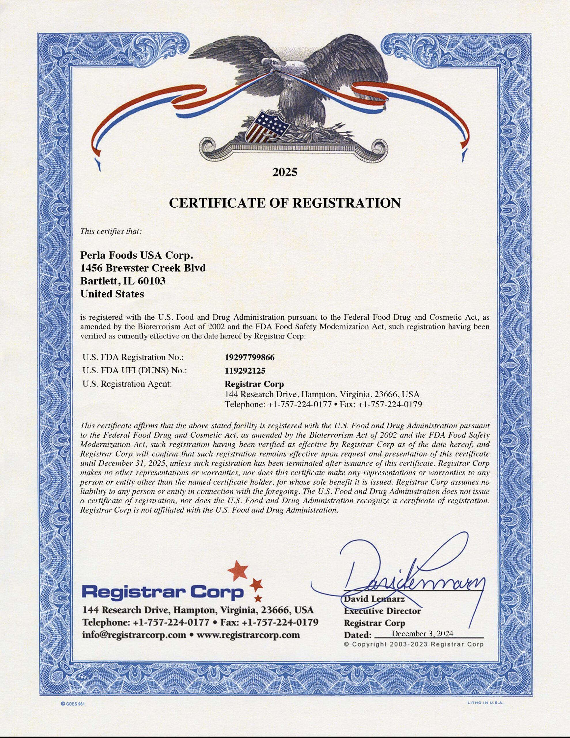 At Perla Foods USA Corp., we uphold the highest hygiene, production, and sourcing standards. Our modern facility follows strict quality controls, using carefully selected ingredients to ensure freshness, safety, and authentic flavor in every product.