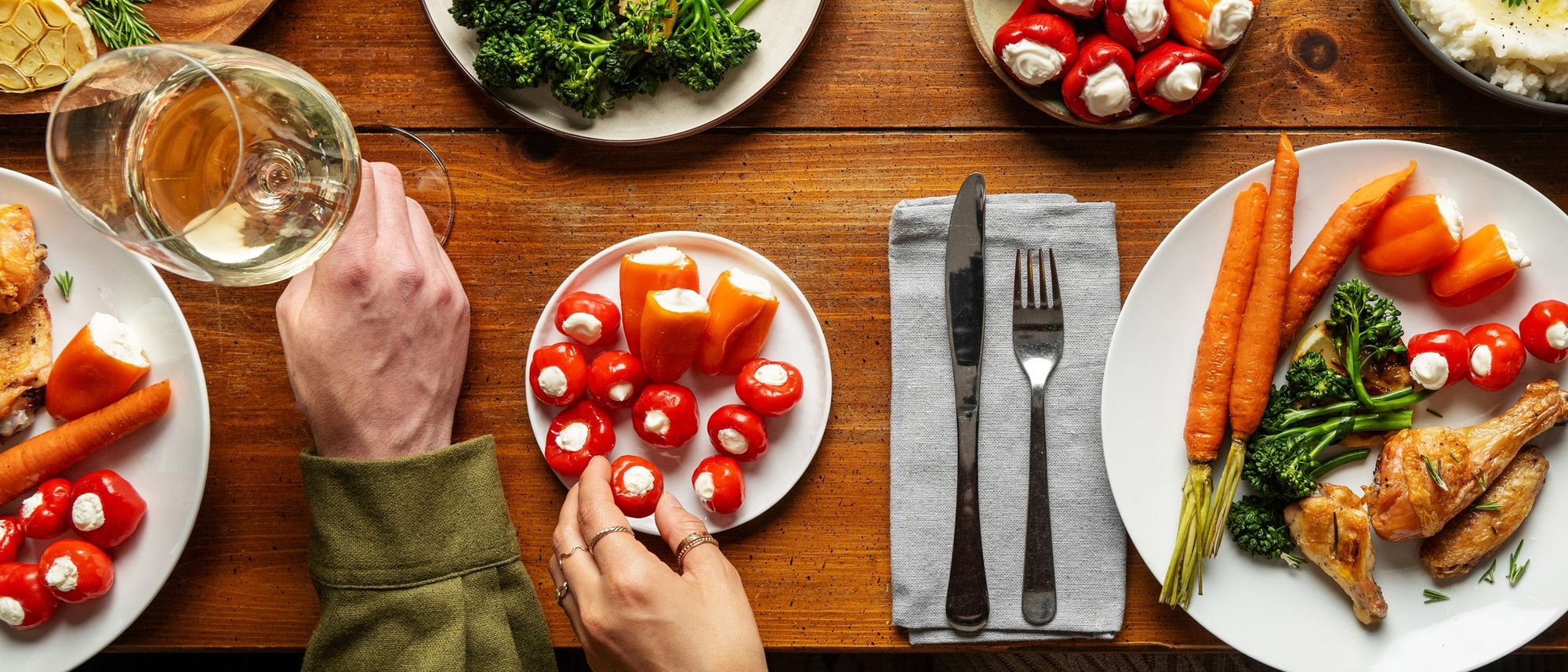 peppers with creamycheese filling, marinated olives and hummusspreads.